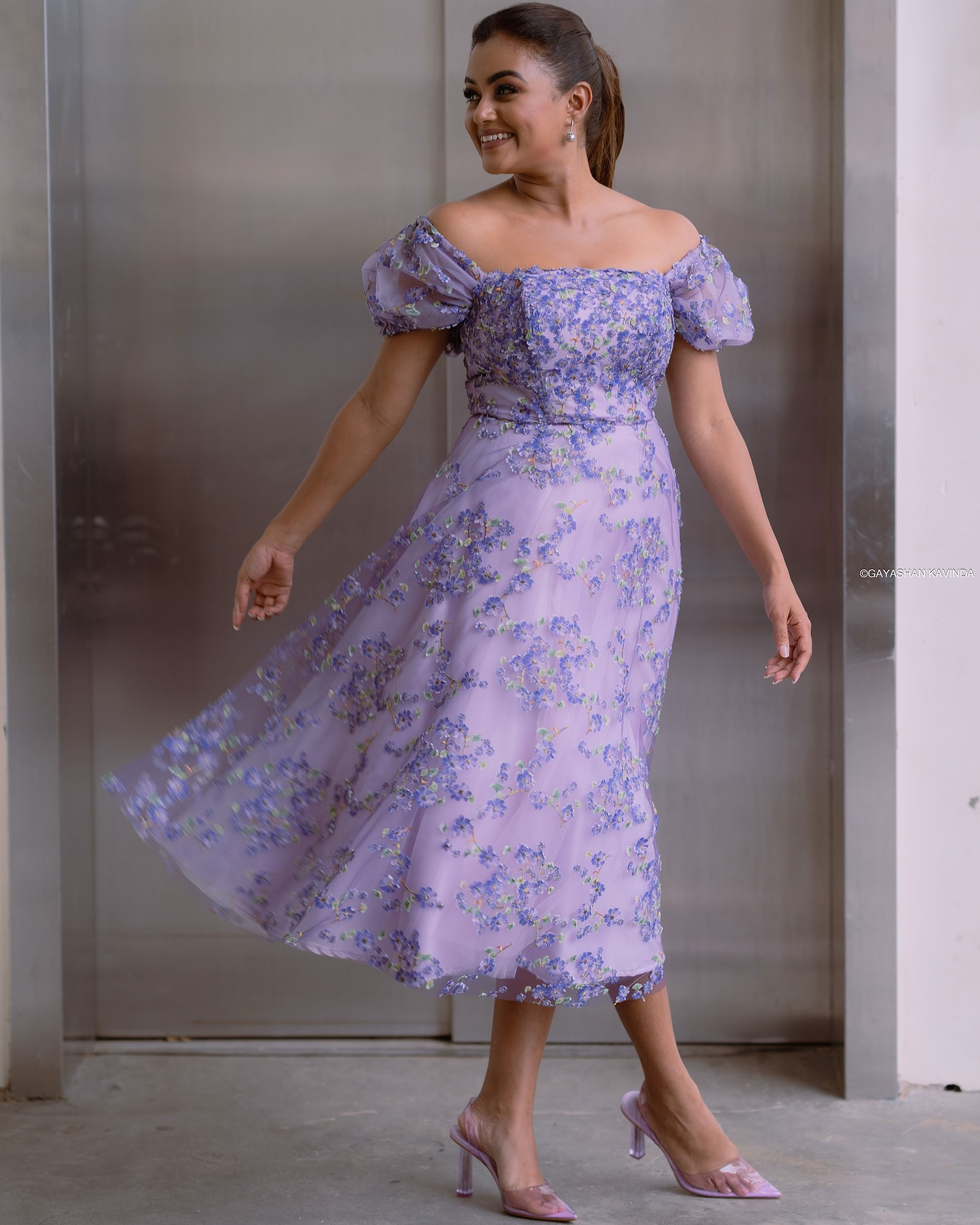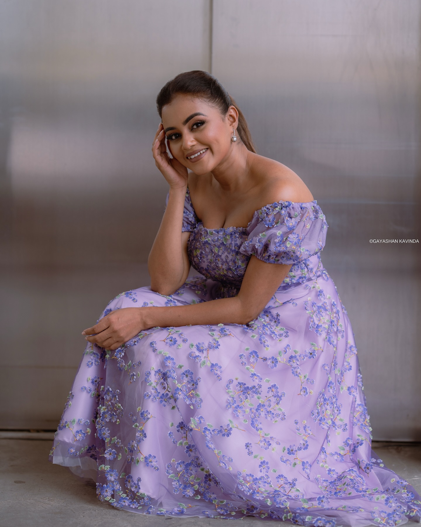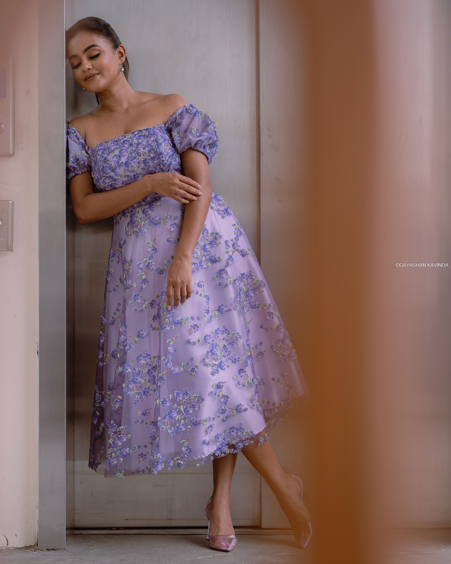 "නැගු මල් සිනා හද පුරා සුවඳ දීලා " දම් පාට හැඩපිරුණු ලස්සන ගවුම් විලාසිතාවට එයා නම් බෝනික්කියක් වගේ සුන්දරයි -photos