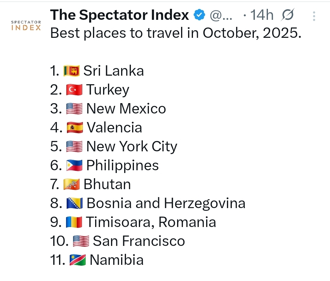 2025 ඔක්තෝබර් මාසයේදී සංචාරය කිරීමට හොඳම ගමනාන්තය ලෙස ගෝලීය සංචාරක සඟරාවක් වන ටයිම් අවුට් විසින් ශ්‍රී ලංකාව ශ්‍රේණිගත කර ඇති අතර, එම මාසයේ වාර්ෂික සංචාරක ස්ථාන ලැයිස්තුව ද ඔවුන් විසින් එළිදක්වා තිබෙනවා.