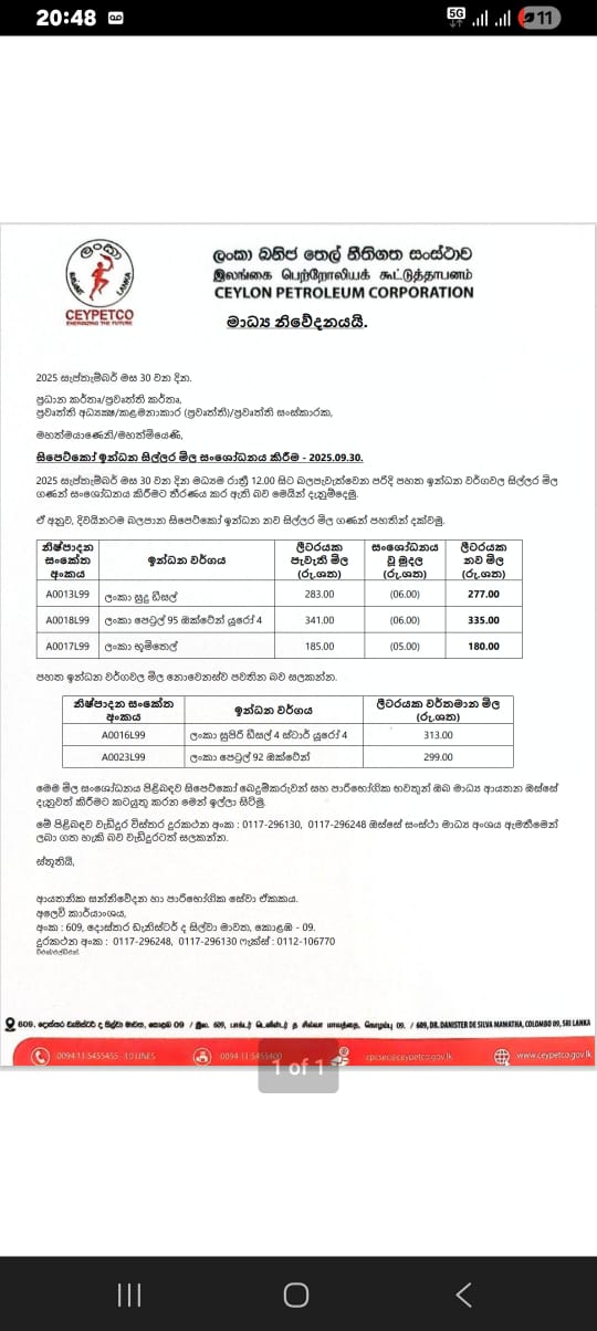 ඉන්ධන මිල සූත්‍රය අනුව මාසිකව සිදුවන මිල සංශෝධනයෙන් අද (30) මධ්‍යම රාත්‍රියේ සිට ක්‍රියාත්මක වන පරිදි ඔක්තෝබර් මාසයට අදාළව සිපෙට්කෝ ඉන්ධන මිලෙහි සංශෝධනයක් සිදුව තිබෙනවා.