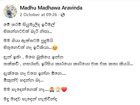 නිරන්තරයෙන් සිය සිතැඟි අකුරු කරන මදු මාධව හරි අපූරූ සටහනක් සිය ෆේස්බුක් ගිණුමේ තබා තිබුණා.