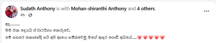 - "අද...මම එක දෙයයි ප්‍රාර්ථනා කෙරුවෙ, මේ සසරෙ කොහේදි හරි අපි ආයෙ හම්බවෙමු මගේ ආදර පොඩි අයියේ..." සුදත් ඇන්තනී සංවේගයෙන් තැබූ සටහන...Hiru Gossip, Hiru news, Gossip Lanka News | Hirugossip | Hiru Gossip | Hiru Fm Gossip | Hiru Gossip Official Web Site | Gossip Lanka