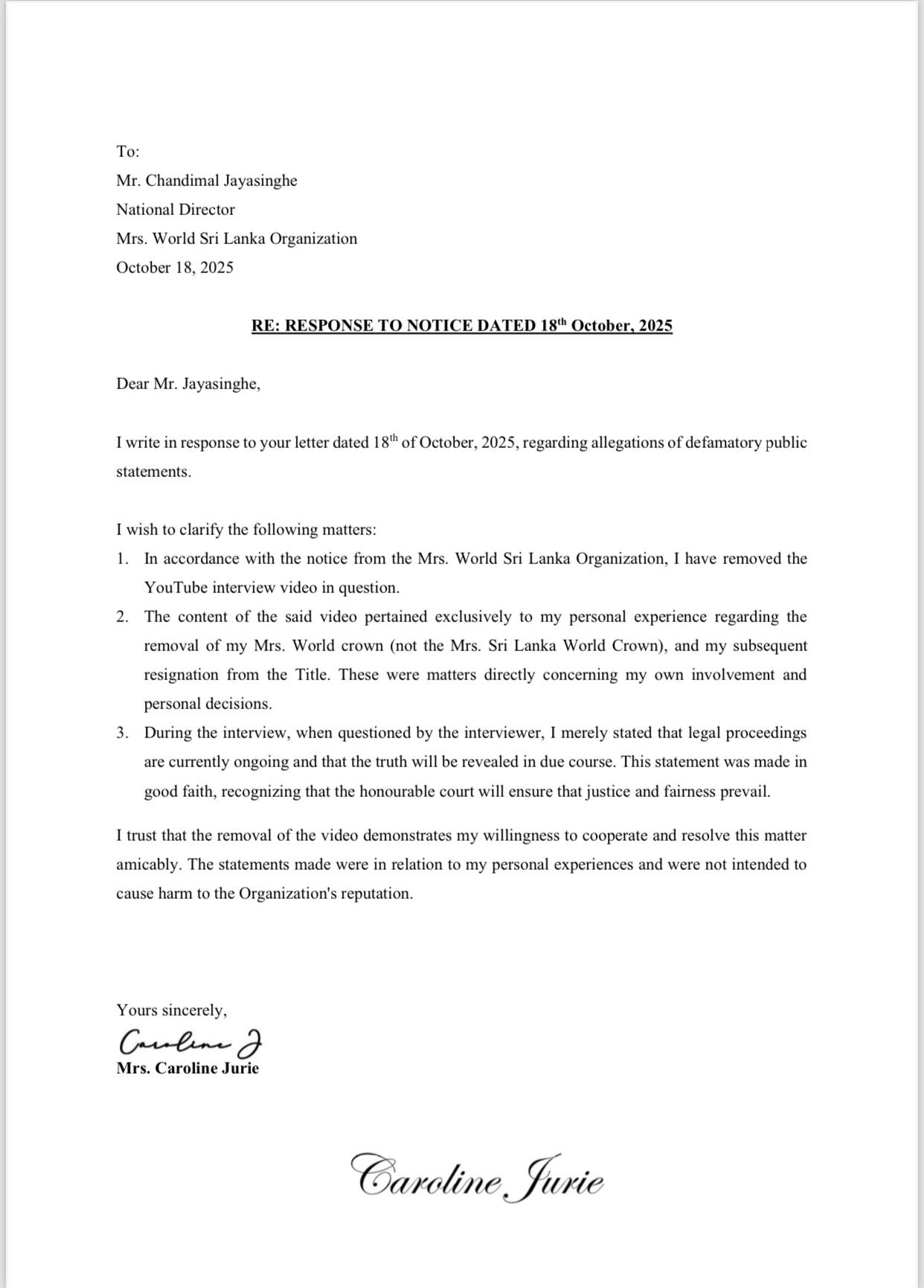 පසුගිය දිනයක හිටපු ශ්‍රී ලංකා විවාහක රූ රැජින වන කැරොලයින් ජූරි විසින් 'Mrs. Sri Lanka' (Mrs. World Sri Lanka Organization) සංවිධානයේ ජාතික අධ්‍යක්ෂ චන්දිමාල් ජයසිංහ වෙත ලිපියක් යොමුකර තිබුණා.
