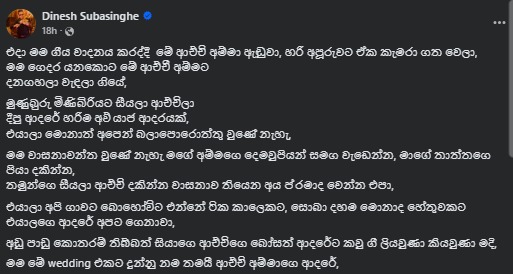 ඒත් බොහෝ තැන්වල මේ ආදරය තියෙන්නේ හැංගිලා. නැත්නම් අප්‍රකාශිතව. ඒත් සමහර තැන්වල මේ ආදරය හරිම ලස්සනයි. දිනේෂ් සුබසිංහ, අපේ රටේ කවුරුත් ආදර කරන මේ ප්‍රවීණ වයලීන් වාදන ශිල්පියා සහභාගී වුණු විවාහ මංගල උත්සවයකදීත් ඔහුගේ නෙත ගැටෙන්නේ අන්න ඒ වගේ ආච්චි අම්මා කෙනෙක්. දිනේෂ් මෙන්න මේ විදිහට ඒ ගැන තමන්ගේ මුහුණුපොතට සටහනක් එක්කරනවා.