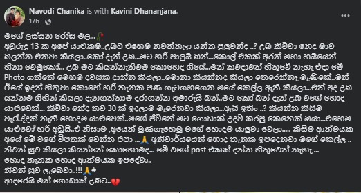 ඇය වෘත්තියෙන් රූපලාවන්‍ය උපදේශිකාවක්. කවිනි ධනංජනී නම් වූ මේ සුරූපී තරුණිය ශ්‍රී ලංකා වෘත්තීය පුහුණු අධිකාරියේ වැලිමඩ, දිවිතොටවෙල ශාඛාවේ සේවයේ නිරත වුණු අතර පවතින අයහපත්කාලගුණ තත්වයත් එක්ක නොසිතූ නිමේෂයක මේ තරුණියට දිවි අහිමිවෙනවා. මේ පුවතෙන් සංවේගයට පත් ඇයගේ සහෝදරයා සහ මිතුරියක් මුහුණුපොතට එක්කළ හද කම්පා කරන සටහන් ද්විතයක් මෙන්න මේ වගේ දැකගන්න ලැබුණා.