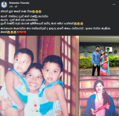 අවුරුදු 13 ක අපේ යාළුකම.. උබට එහෙම නවත්තලා යන්න පුලුවන්ද ..? උබ කිව්වා නෙද මාව බලන්න එනවා කියලා..කෝ දැන් උබ...මට හරි පාලුයි බන්...කොල් එකක් අරන් මහා හයියෙන් හිනා වෙමුකෝ... උබ මට කියන්නැතිවම කොහෙද ගියේ...මන් කවදාවත් හිතුවේ නැහැ එදා මේ Photo ගත්තේ මෙහම දවසක දාන්න කියලා..මොනා කියන්නද කියලා තෙරෙන්නෑ මැණිකේ..මන් ඊයේ ඉදන් හිතුවා කොහේ හරි තැනක පණ ගැටගහගෙන මයේ කෙල්ල ඇති කියලා...එත් අද උබ යන්නම ගිහින් කියලා දැනගත්තාම දරාගන්න අමාරුයි බන්..මට කෝ බන් දැන් උබ වගේ හොද යාළුවෙක්... කිව්වා නේද තව 30 ක් ඉදලාම මැරෙනවා කියලා...ඇයි ඉතිං ..? කියන්න කිසිම වැරැද්දක් නැති හොදම යාළුවෙක්..මගේ ජිව්තේ මට ගොඩාක් උදව් කරපු කෙනෙක් ඔයා...එහෙම යාළුවෝ හරි අඩුයි..එ නිසාම ,අයෙත් මුණගැහෙමු මගේ හොදම යාලුවා වෙලා..... කිසිම ආත්මයක අයේ මේ වගේ විපතක් වෙන්න එපා.. අනිවාර්යයෙන් හොද තැනක ඉපදෙනවා මගේ කෙල්ල .. නිවන් සුව කියලා කියන්නේ කොහොමද... මේ වගේ post එකක් දන්න හිතුවෙත් නැහැ ...