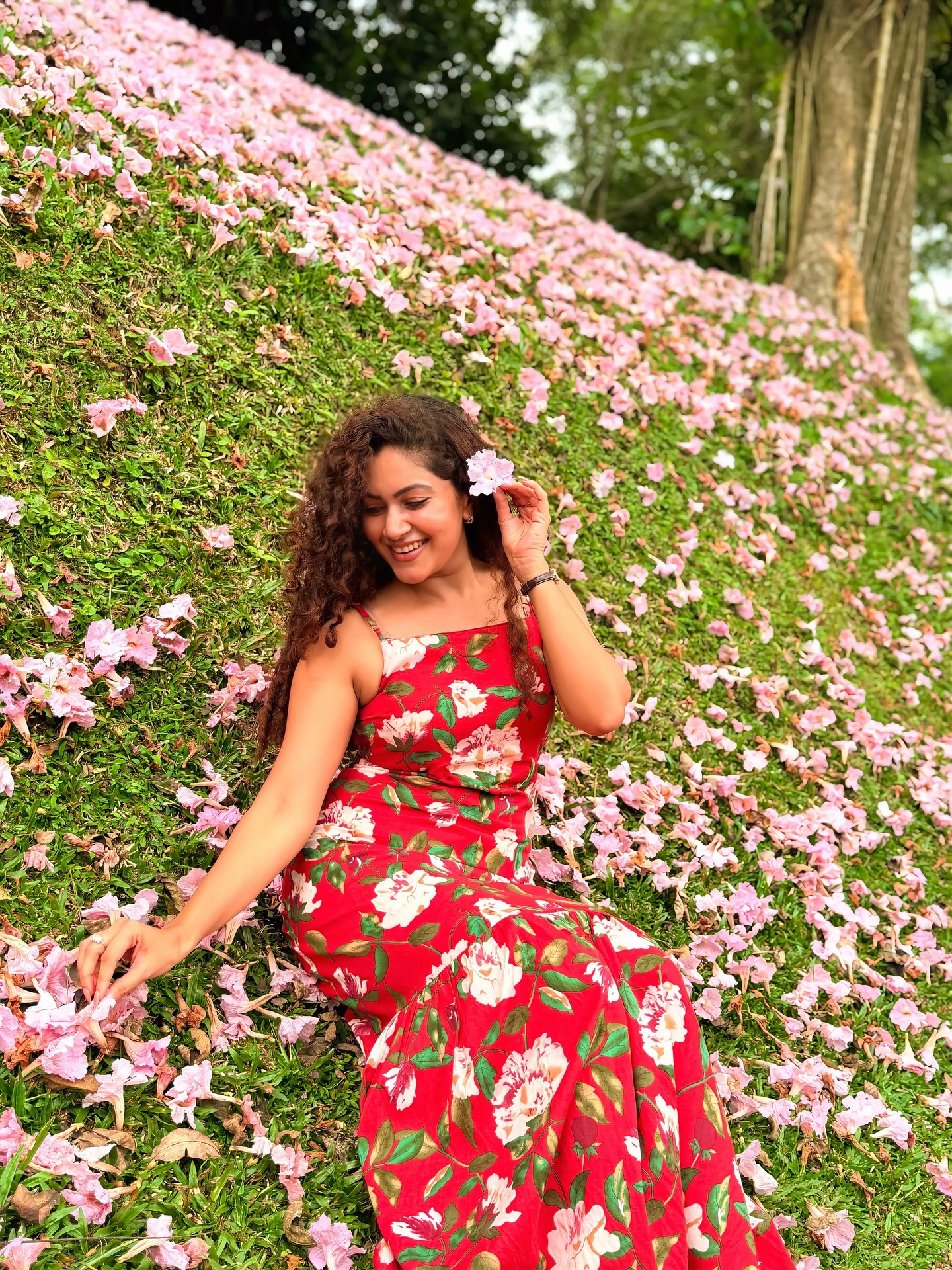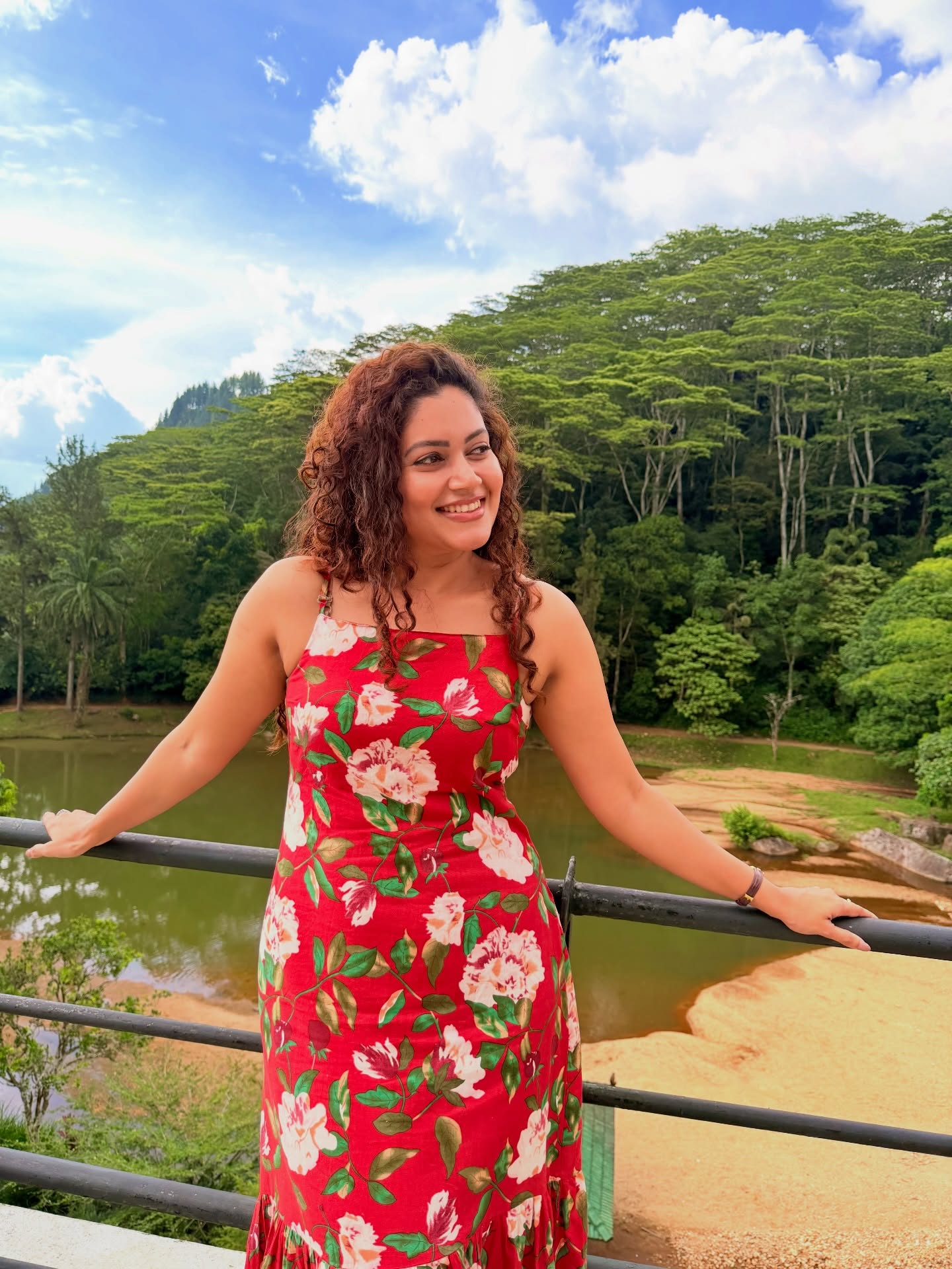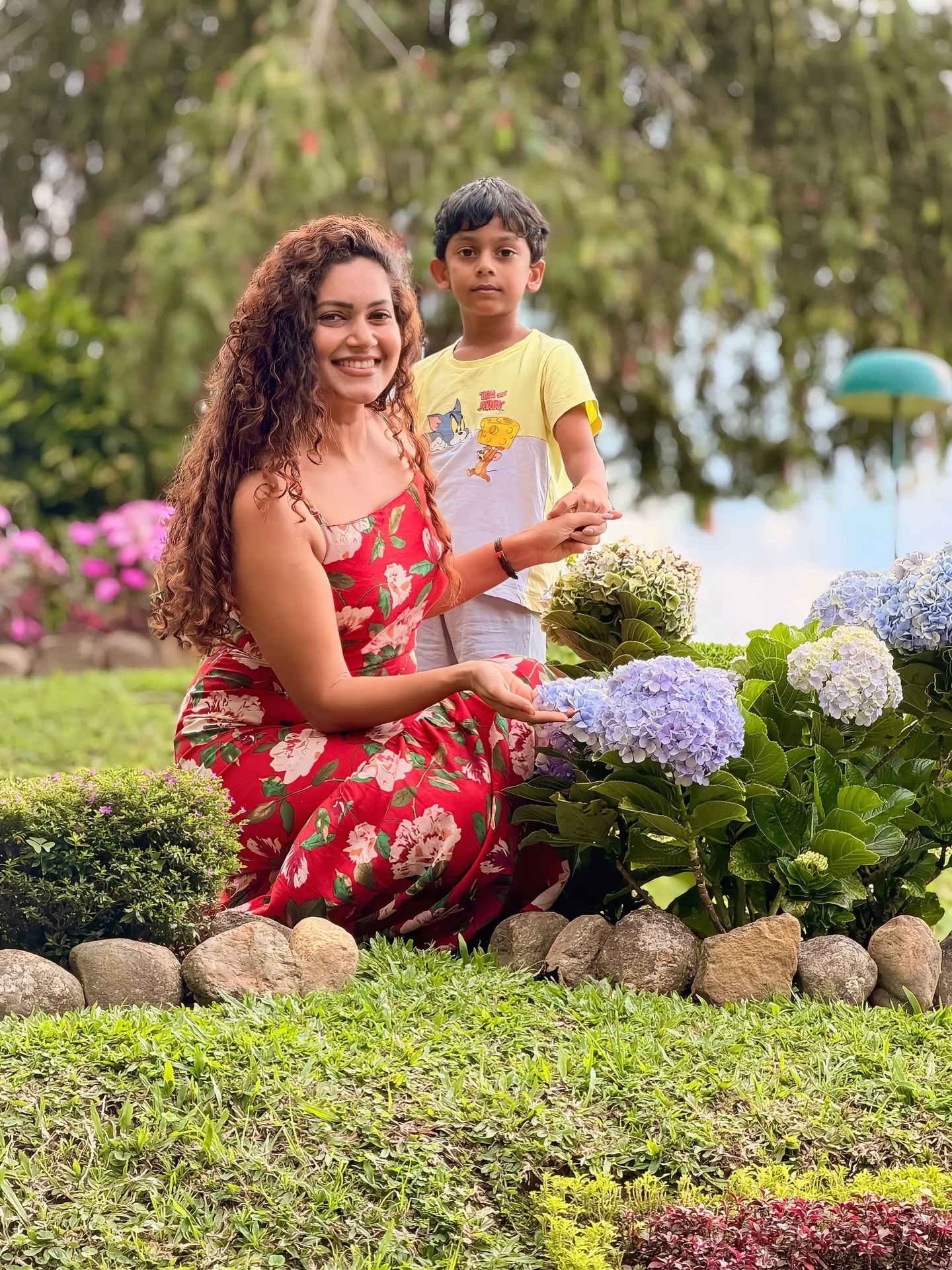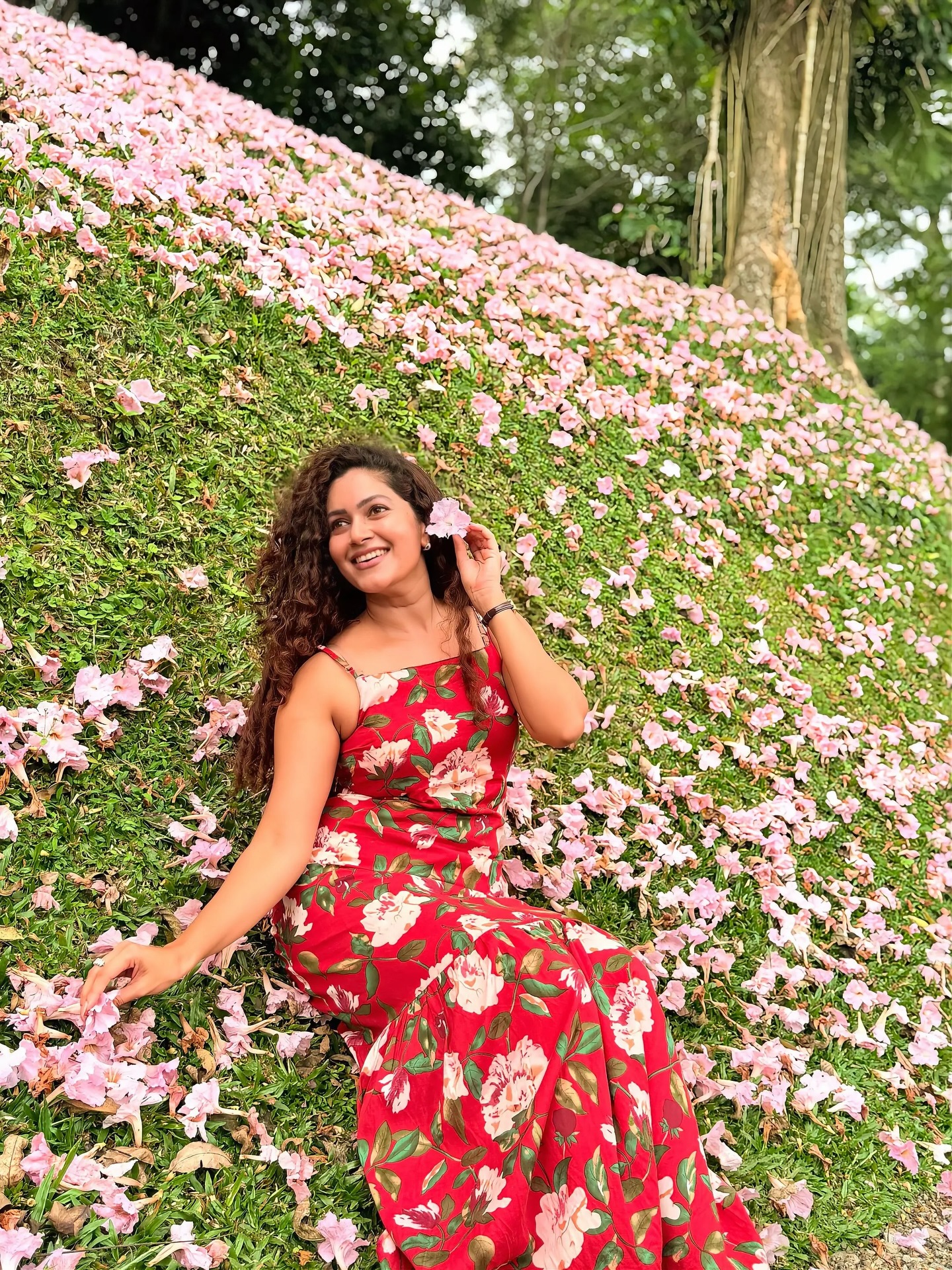 රතු පාට, මල් රටා සහිත ලස්සන ඇඳුමකින් සැරසුණු තාරුකා, මල් යායක් මැද ඉඳන් හිනාවෙන පින්තූර දකිද්දී ඕනෑම කෙනෙක්ගේ හිත පිරෙනවා. දම් පාට මල් ගොමුවක් ළඟ ඇගේ ඒ ලස්සන හිනාව ඇත්තටම හරිම ආකර්ෂණීයයි. තවත් පින්තූරයක ඇය රෝස පාට මල් පිරුණු තණකොළ බිස්සක වාඩිවෙලා, එක මලක් ඇගේ කොණ්ඩයේ ගසාගෙන ඉන්නවා.