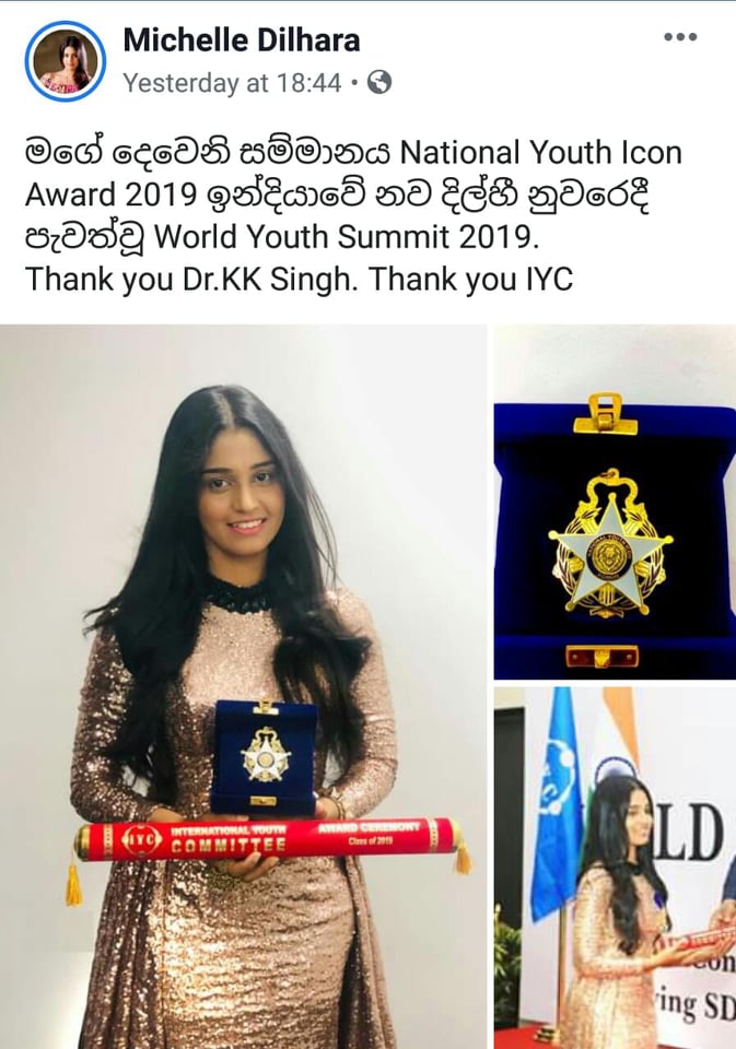 මෙය ඇයගේ දෙවැනි සම්මානය වන අතර ඇය ඒ වෙනුවෙන් සිය ෆේස්බුක් ගිණුමේද සටහනක් තබා තිබුණා.
