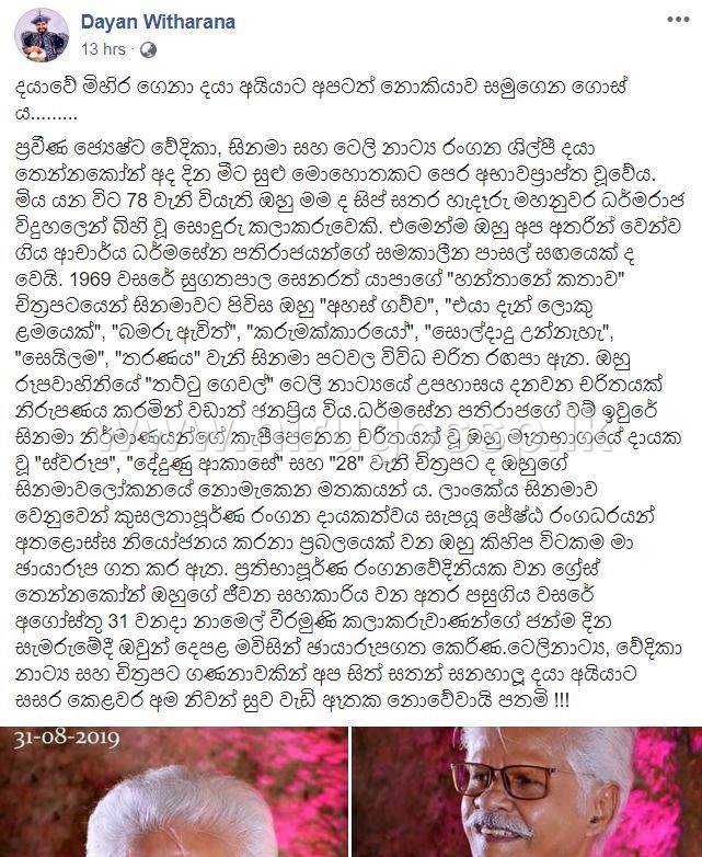 ප්රවීණ ජ්යෙෂ්ට වේදිකා, සිනමා සහ ටෙලි නාට්ය රංගන ශිල්පී දයා තෙන්නකෝන් අද දින මීට සුළු මොහොතකට පෙර අභාවප්රාප්ත වූවේය. මිය යන විට 78 වැනි වියැති ඔහු මම ද සිප් සතර හැදෑරු මහනුවර ධර්මරාජ විදුහලෙන් බිහි වූ සොඳුරු කලාකරුවෙකි. එමෙන්ම ඔහු අප අතරින් වෙන්ව ගිය ආචාර්ය ධර්මසේන පතිරාජයන්ගේ සමකාලීන පාසල් සඟයෙක් ද වෙයි. 1969 වසරේ සුගතපාල සෙනරත් යාපාගේ "හන්තානේ කතාව" චිත්රපටයෙන් සිනමාවට පිවිස ඔහු "අහස් ගව්ව", "එයා දැන් ලොකු ළමයෙක්", "බමරු ඇවිත්", "කරුමක්කාරයෝ", "සොල්දාදු උන්නැහැ", "සෙයිලම", "තරණය" වැනි සිනමා පටවල විවිධ චරිත රඟපා ඇත. ධර්මසේන පතිරාජගේ වම් ඉවුරේ සිනමා නිර්මාණයන්ගේ කැපීපෙනෙන චරිතයක් වූ ඔහු මෑතභාගයේ දායක වූ "ස්වරූප", "දේදුණු ආකාසේ" සහ "28" වැනි චිත්රපට ද ඔහුගේ සිනමාවලෝකනයේ නොමැකෙන මතකයන් ය. ලාංකේය සිනමාව වෙනුවෙන් කුසලතාපූර්ණ රංගන දායකත්වය සැපයූ ජේෂ්ඨ රංගධරයන් අතළොස්ස නියෝජනය කරනා ප්රබලයෙක් වන ඔහු කිහිප විටකම මා ඡායාරූප ගත කර ඇත. ප්රතිභාපූර්ණ රංගනවේදිනියක වන ග්රේස් තෙන්නකෝන් ඔහුගේ ජීවන සහකාරිය වන අතර පසුගිය වසරේ අගෝස්තු 31 වනදා නාමෙල් වීරමුණි කලාකරුවාණන්ගේ ජන්ම දින සැමරුමේදී ඔවුන් දෙපළ මවිසින් ඡායාරූපගත කෙරිණ.ටෙලිනාට්ය, වේදිකා නාට්ය සහ චිත්රපට ගණනාවකින් අප සිත් සතන් සනහාලූ දයා අයියාට සසර කෙළවර අම නිවන් සුව වැඩි ඈතක නොවේවායි පතමි !!!