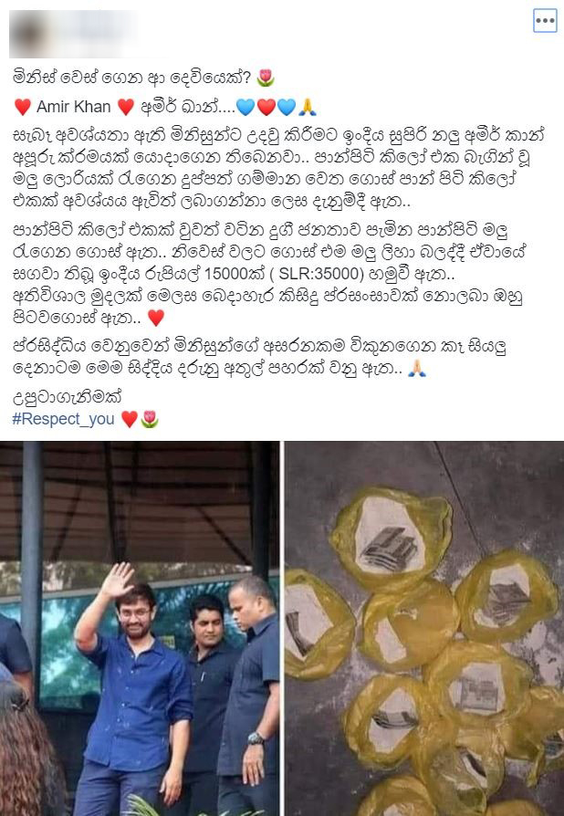 සැබෑ අවශ්යතා ඇති මිනිසුන්ට උදවු කිරීමට ඉංදීය සුපිරි නලු අමීර් කාන් අපූරු ක්රමයක් යොදාගෙන තිබෙනවා.. පාන්පිටි කිලෝ එක බැගින් වූ මලු ලොරියක් රැගෙන දුප්පත් ගම්මාන වෙත ගොස් පාන් පිටි කිලෝ එකක් අවශ්යය ඇවිත් ලබාගන්නා ලෙස දැනුම්දී ඇත..