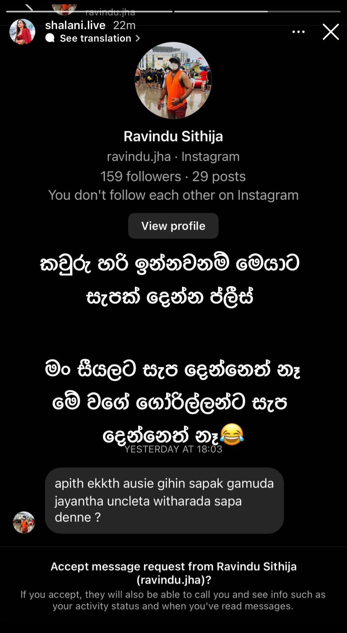 මේ අතර ශලනි තාරකාගේ මුහුණු පොතට කෙටි පණිවුඩයක් යැවූ පුද්ගලයෙක්ගේ එම කෙටි පණිවුඩය ප්‍රසිද්ධියේ ඇගේ සමාජ ජාලාවල පළ කරමින් ශලනි ටිකක් සැර කතාවක් කියලා තිබුනා.