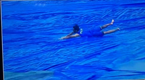 ක්‍රීඩාංගණයේ අතුරා ඇති වැහි ආවරණ සමඟ හසන් අලී විනෝද වන අයුරු ට්විටර් වෙබ් අඩවියේ හුවමාරු වන වීඩියෝ දර්ශනවල දැක ගන්නට පුලුවන්.
