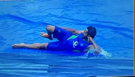 තරගය නතර කිරීමෙන් පසු පාකිස්ථානු මදවේග පන්දු යවන ක්‍රීඩක හසන් අලී වර්ෂාවේ විනෝදවන අයුරු දැක ගන්නට හැකි වුනා.