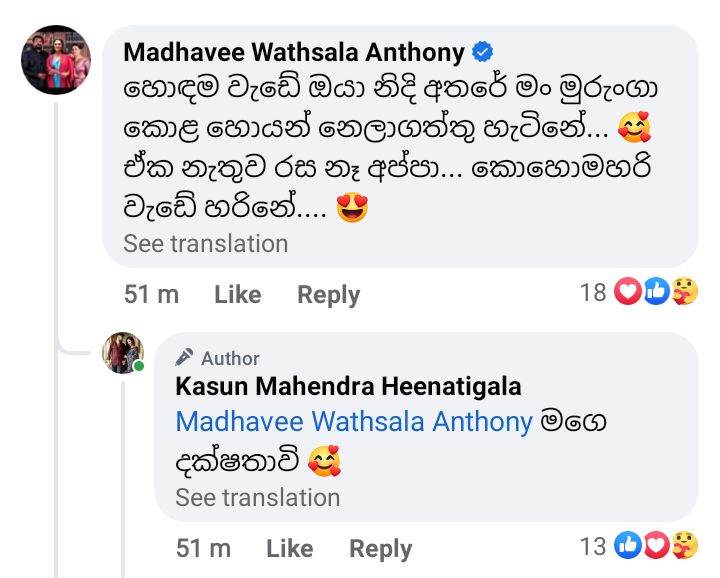 අද දවසෙම වැස්සෙ ගෙදරට වෙලා ඉඳපු කසුන්ට මාධවීගේ ආදරේ මුසු කරලා හදලා දීපු රසම රස කෑමක් ගැන කසුන් ෆේස්බුකියේ සටහන් කරලා තිබුනේ මෙහම.