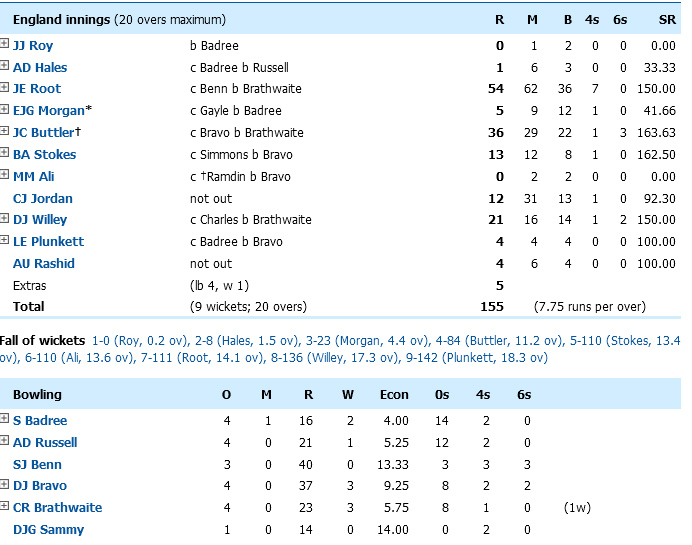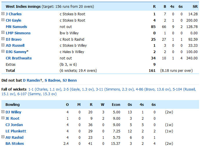 Carlos Brathwaite hit the first four balls of the final over for six as West Indies, and the windies who were 11 for 3 in pursuit of England's 155 for 9, needed 19 off the final over to win and did it in style.